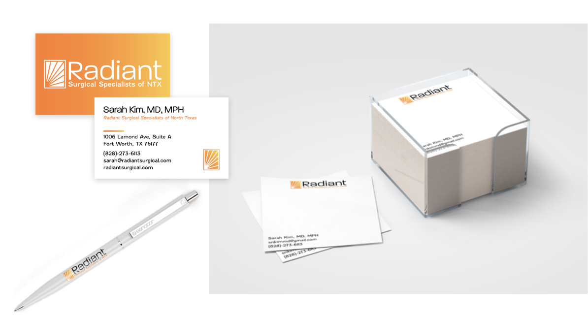 Sarah Kim, MD, MPH, is a general surgeon specializing in trauma surgery and minimally invasive robotic surgical techniques. For her new endeavor as a referral-based surgeon, she needed a brand that would capture the sense of optimism that she strives to give her patients: the hope of a better life and the ability to feel better faster. She required a logo that was flexible enough to exist in many different sizes and spaces while also remaining recognizable to her patients to instill a sense of professionalism and stability. Radiant Surgical Specialists offered a unique challenge to create a brand that was fun yet professional, hopeful yet serious, and technical yet accessible.