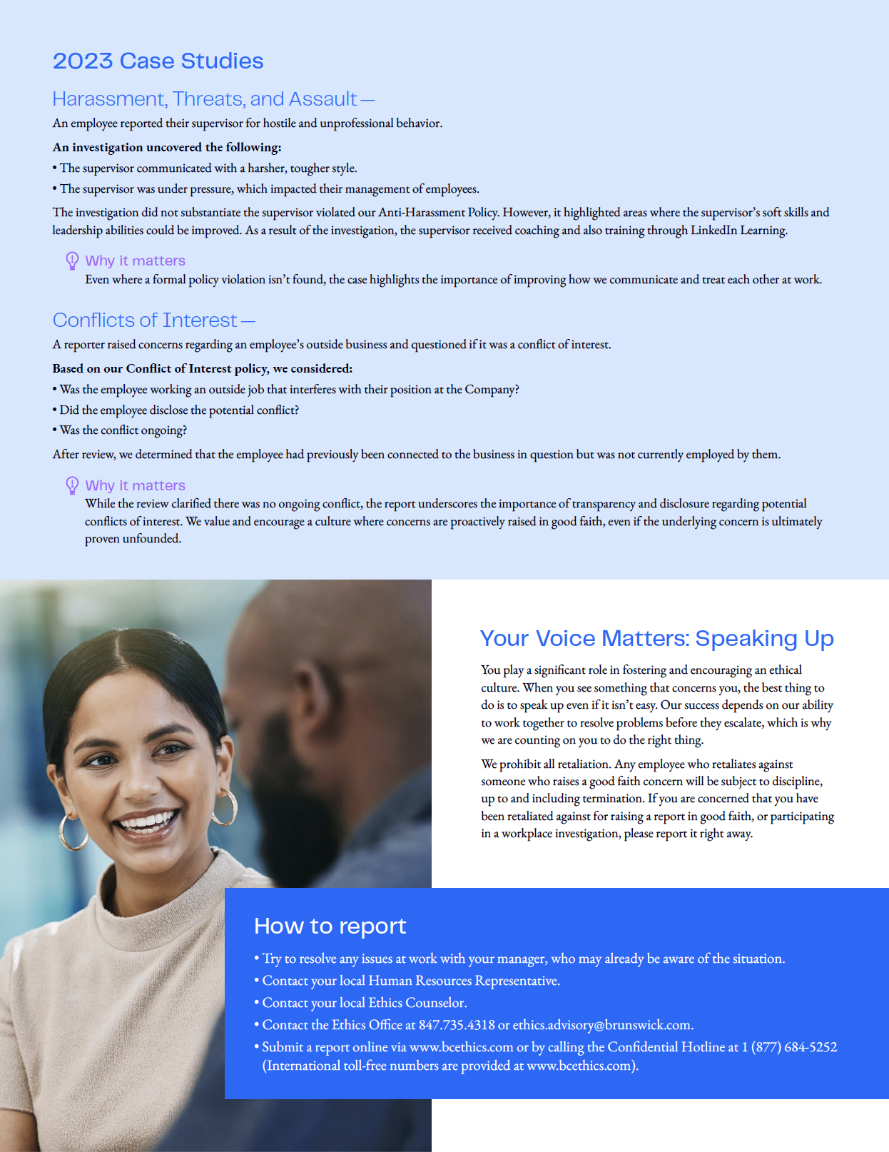 Brunswick Corporation’s Ethics Office creates and distributes their annual Speak Up Report to provide the company with key information about the past year’s reported cases, company processes, and general trends in comparison to years past. This short report allows employees a chance to look behind the curtain and ensure that their voices are being heard. My goal was to balance imagery, create graphs, and pay careful attention to type hierarchy in order to display the technical and statistics heavy information in an easy to read and impactful manner.